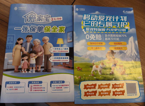 中国移动营业厅展示的“爱家宝”、“移动爱宠计划”宣传单。图片来源:界面新闻记者拍摄