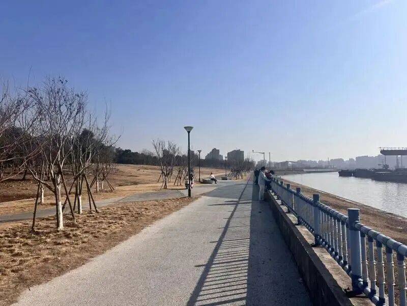 滨水闲情:蕰藻浜畔的临水步道视野开阔,微风拂过水面泛起粼粼波光,午后暖阳下散步、,或是与家人聊聊家常,都能感受岁月静好的新春氛围。